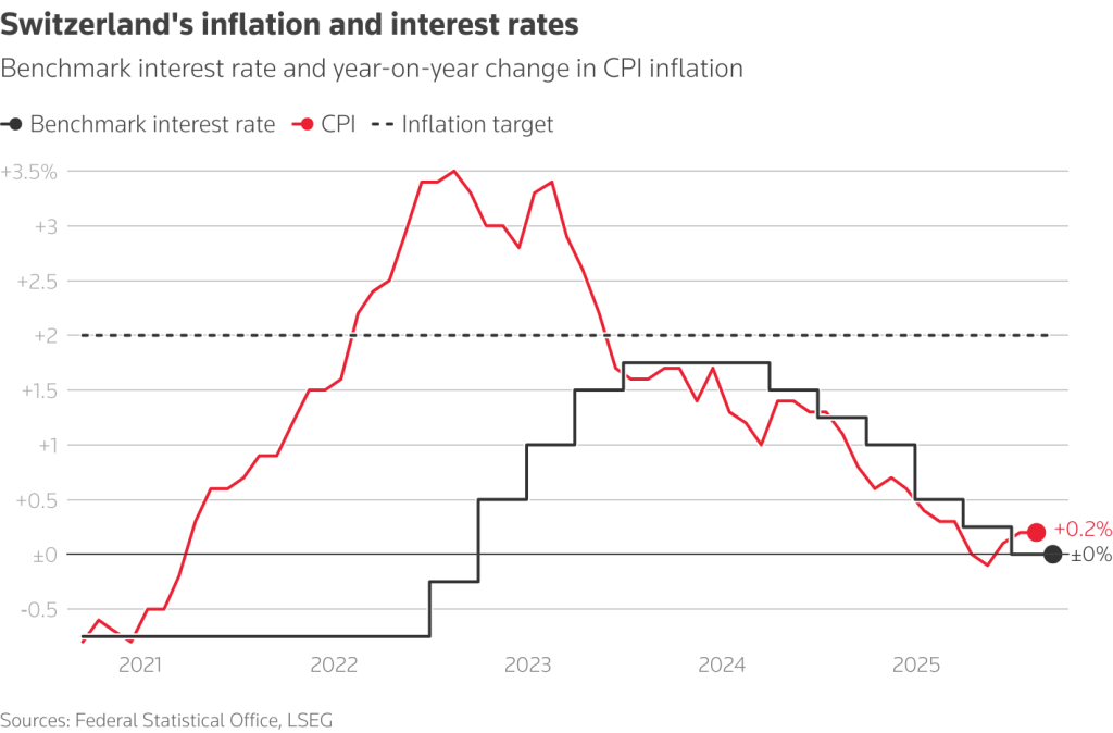 Παρόλο που ο πληθωρισμός στην Ελβετία είναι μηδενικός, καθώς το ισχυρό φράγκο ως ασφαλές καταφύγιο μειώνει το κόστος των εισαγωγών, το όριο για τη μετατροπή των επιτοκίων σε αρνητικά είναι υψηλό και οι οικονομολόγοι αναμένουν ότι η αύξηση των τιμών θα ανακάμψει ελαφρώς το επόμενο έτος και ότι η SNB θα διατηρήσει αμετάβλητα τα επιτόκια καθ’ όλη τη διάρκεια του 2026.