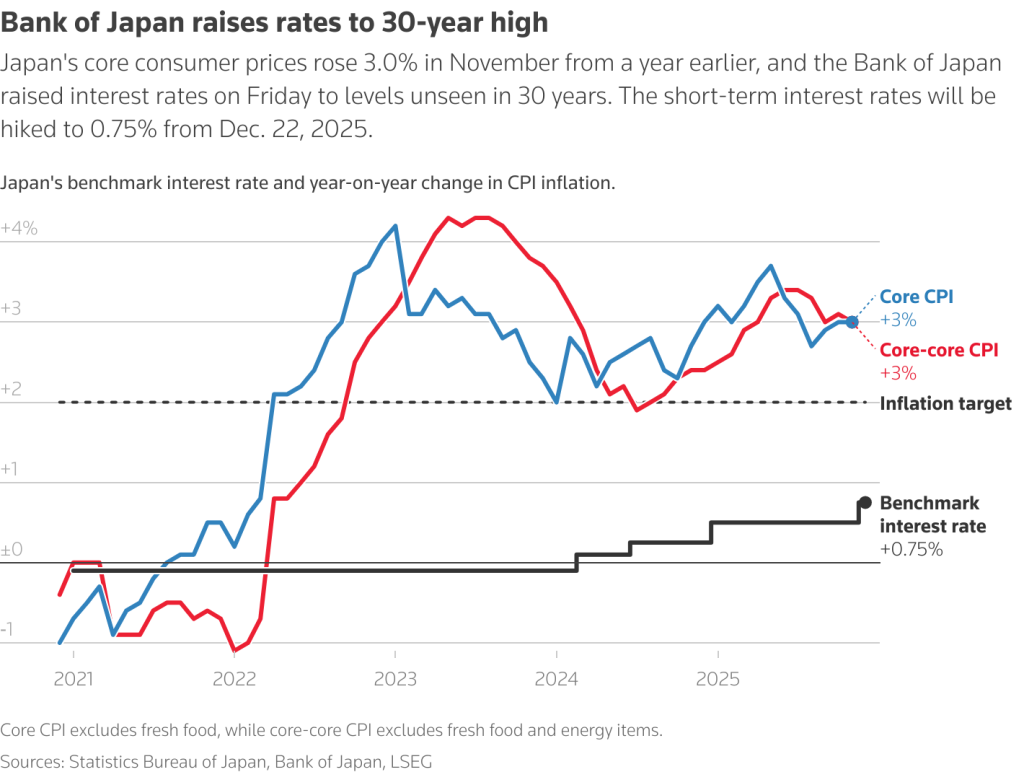 Η Τράπεζα της Ιαπωνίας αύξησε τα επιτόκια στο 0,75% την Παρασκευή και αναθεώρησε προς τα πάνω τις προβλέψεις της για την ανάπτυξη και τον πληθωρισμό, αν και το γεν σημείωσε απότομη πτώση, ενώ οι αποδόσεις των ιαπωνικών κρατικών ομολόγων επίσης αυξήθηκαν, στέλνοντας ανάμεικτα μηνύματα στην αγορά σχετικά με την πιθανότητα περαιτέρω αυξήσεων.