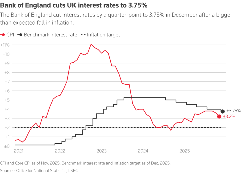 Οι υπεύθυνοι για τον καθορισμό των επιτοκίων της Τράπεζας της Αγγλίας ψήφισαν με μικρή πλειοψηφία την Πέμπτη για μείωση κατά ένα τέταρτο του ποσοστού στο 3,75% και ο διοικητής Andrew Bailey προειδοποίησε ότι η μελλοντική χαλάρωση της νομισματικής πολιτικής είναι αβέβαιη.