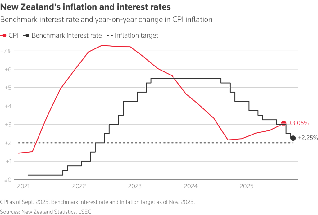 Ωστόσο, μετά από μια σειρά από δραστικές μειώσεις των επιτοκίων που συνέβαλαν στην άνοδο του πληθωρισμού στο ανώτατο όριο του στόχου της κεντρικής τράπεζας, οι χρηματαγορές εκτιμούν ότι το επιτόκιο της Νέας Ζηλανδίας θα προσεγγίσει το 3% έως τον Δεκέμβριο του 2026 από το 2,25% που είναι σήμερα.