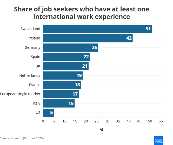 Η Ελβετία έχει το υψηλότερο ποσοστό διεθνούς εργασιακής εμπειρίας, με περισσότερους από τους μισούς αναζητούντες εργασία (51%) να αναφέρουν εμπειρία στο εξωτερικό. Το ποσοστό αυτό είναι πάνω από δύο στους πέντε (42%) στην Ιρλανδία.
