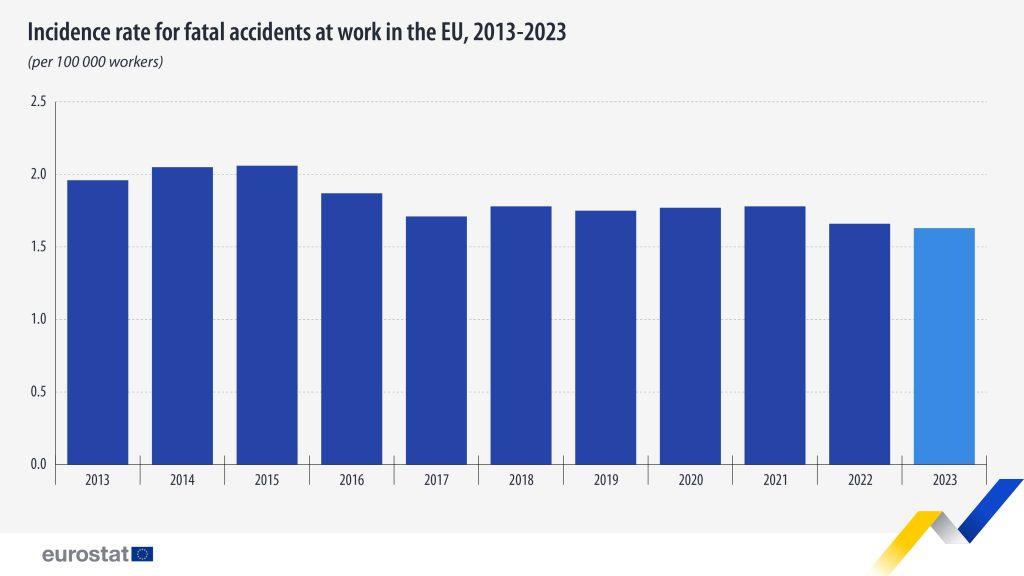 Σε ολόκληρη την ΕΕ, καταγράφηκαν κατά μέσο όρο 1,63 θάνατοι ανά 100.000 εργαζόμενους το 2023, σε σύγκριση με 1,66 θανάτους το 2022. Το ποσοστό επίπτωσης παρέμεινε κάτω από 2 θανάτους ανά 100.000 εργαζόμενους από το 2016.