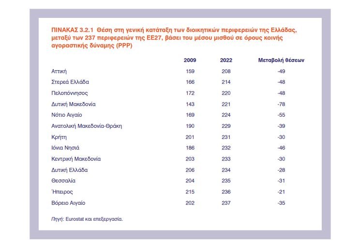 Μεταξύ των 237 περιφερειών του δείγματος των χωρών της ΕΕ27 για τις οποίες υπάρχουν διαθέσιμα στοιχεία, οι ελληνικές περιφέρειες καταλαμβάνουν τις τελευταίες θέσεις στον μέσο μισθό, σε όρους αγοραστικής δύναμης.