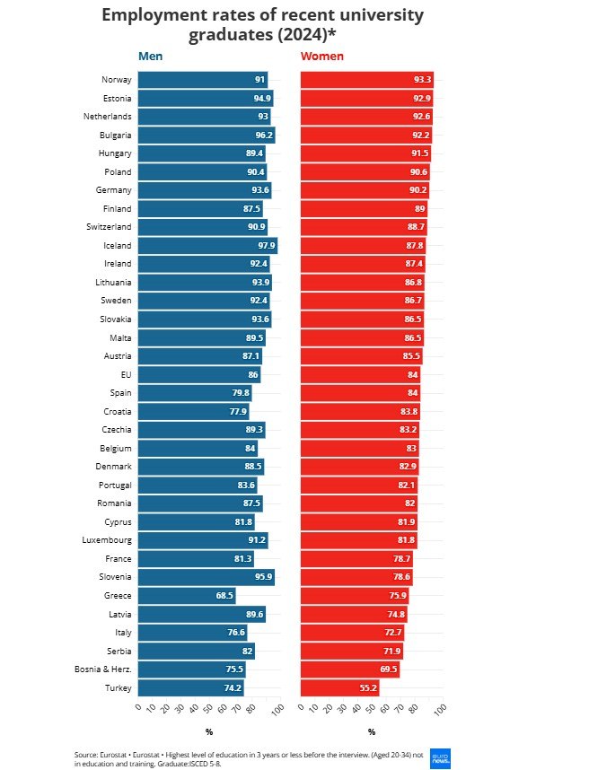 Έτσι, οι δύο γειτονικές χώρες βρίσκονται στα δύο άκρα του φάσματος όσον αφορά την ισότητα των φύλων στην απασχόληση αποφοίτων. Η Τουρκία έχει το χαμηλότερο ποσοστό απασχόλησης γυναικών αποφοίτων (55,2%), με σχεδόν τις μισές απόφοιτες (44,8%) εκτός αγοράς εργασίας. Στην κορυφή αυτής της κατηγορίας βρίσκεται η Νορβηγία, η οποία καταγράφει το υψηλότερο συνολικό ποσοστό, με 93,3% των πρόσφατων αποφοίτων να εργάζονται.