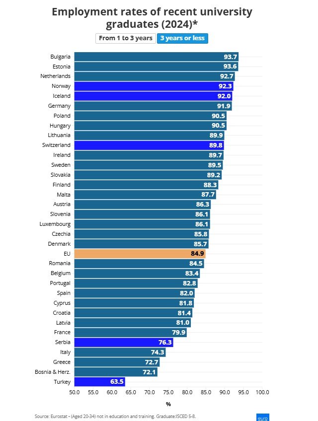 Οι οκτώ χώρες με ποσοστό απασχόλησης πρόσφατων πτυχιούχων που υπερβαίνει το 90% είναι η Βουλγαρία (93,7%), η Εσθονία (93,6%), οι Κάτω Χώρες (92,7%), η Νορβηγία (92,3%), η Ισλανδία (92,0%), η Γερμανία (91,9%), η Ουγγαρία και η Πολωνία (αμφότερες με 90,5%).