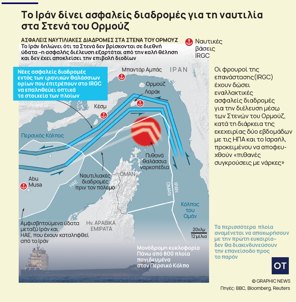 Ο αμερικανός πρόεδρος Ντόναλντ Τραμπ δήλωσε την Τρίτη ότι η εκεχειρία εξαρτάται από το «πλήρες, άμεσο και ασφαλές άνοιγμα» των Στενών, από το οποίο διέρχεται περίπου το ένα πέμπτο των παγκόσμιων προμηθειών πετρελαίου και φυσικού αερίου.