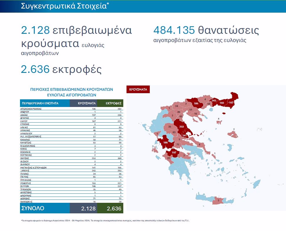 Σύμφωνα με τα συγκεντρωτικά στοιχεία που παρουσιάστηκαν, για το διάστημα από τον Αύγουστο του 2024 έως και τις 8 Μαρτίου 2026 έχουν καταγραφεί συνολικά 2.128 επιβεβαιωμένα κρούσματα, 2.636 εκτροφές και 484.135 θανατώσεις αιγοπροβάτων.