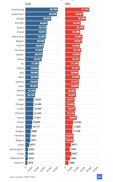 Στην κορυφή, η Ελβετία και η Νορβηγία ακολουθούν το Λουξεμβούργο στην κορυφή της κατάταξης, ακολουθούμενες από τη Δανία, την Αυστρία, την Ιρλανδία, την Ολλανδία και το Βέλγιο, όλες εντός του εύρους των 30.000–35.000 ευρώ. Η Φινλανδία, η Γερμανία, η Σουηδία και η Γαλλία βρίσκονται επίσης πάνω από τον μέσο όρο της ΕΕ.