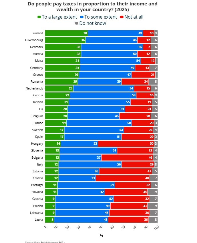 Στον αντίποδα, Λιθουανία, Πολωνία και Τσεχία (9%) βρίσκονται κοντά στη Λετονία, με ελάχιστους πολίτες να συμμερίζονται την άποψη ότι οι πλούσιοι πληρώνουν όσα τους αναλογούν. Στις μεγαλύτερες οικονομίες της ΕΕ, η Ιταλία εμφανίζει το χαμηλότερο ποσοστό, μόλις 12%. Κάτω από τον ευρωπαϊκό μέσο όρο βρίσκονται επίσης η Ισπανία (17%) και η Γαλλία (19%).