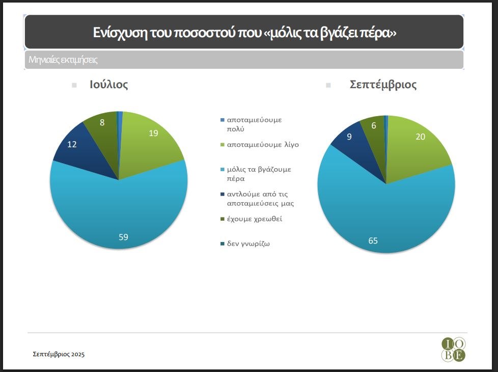 Σύμφωνα με την τελευταία έρευνα καταναλωτικής εμπιστοσύνης του ΙΟΒΕ, το 65% των νοικοκυριών μόλις τα βγάζουν πέρα , ποσοστό αυξημένο κατά 6 ποσοστιαίες μονάδες σε σχέση με τον Ιούλιο. Αν προσθέσουμε όσους αντλούν από τις αποταμιεύσεις τους (9%) και όσους έχουν χρεωθεί (6%), φτάνουμε σε ένα 80% που αντιμετωπίζει από κάποια ως μεγάλη δυσκολία να τα βγάλει πέρα. Πρόκειται για το ίδιο ποσοστό που εμφανίζεται στις στατιστικές της Εurostat για το κόστος ζωής και την υποκειμενική φτώχεια και είναι υπερδιπλάσιο από τον μέσο όρο της Ευρώπης.