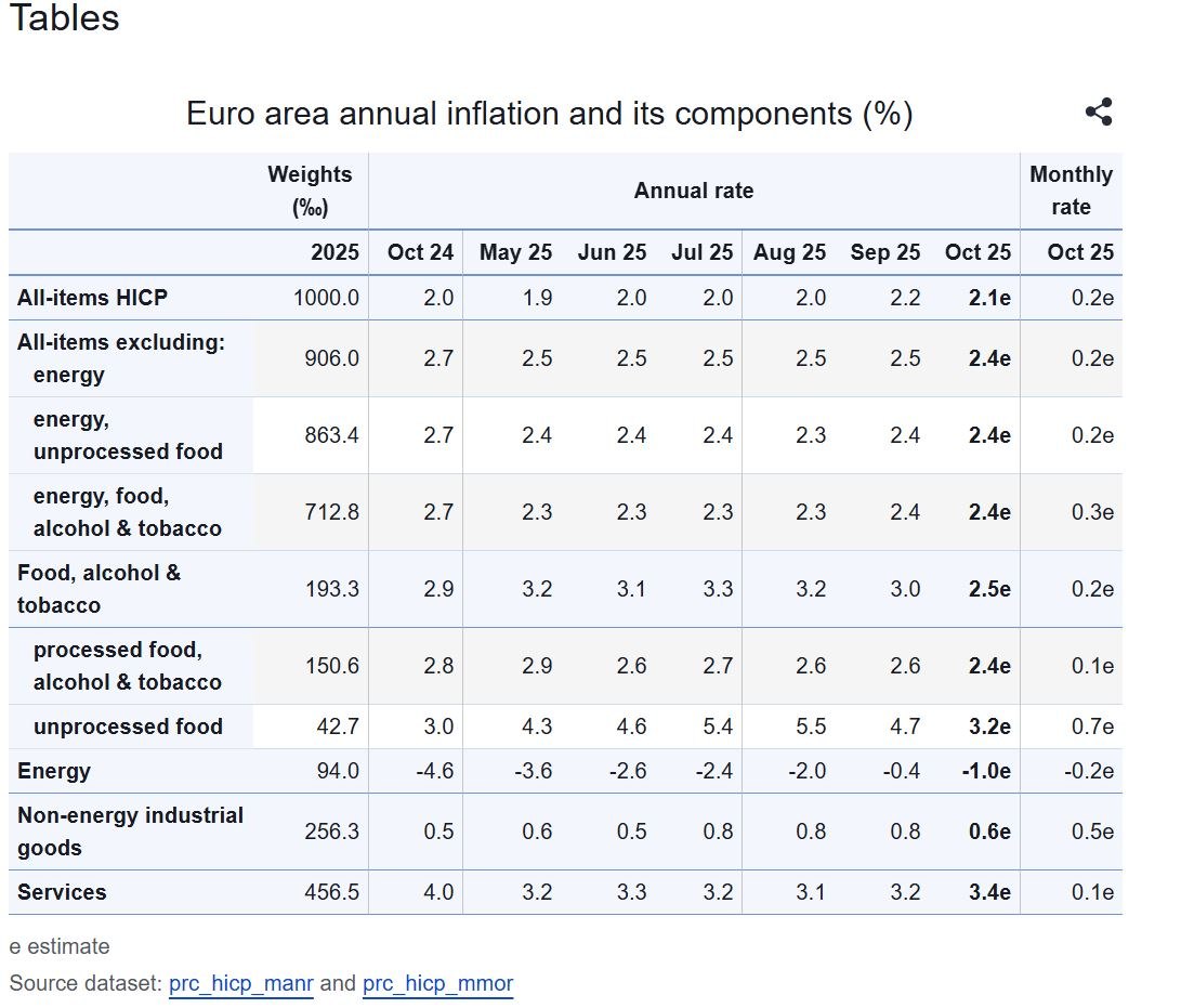 Αν και ο ρυθμός αύξησης του πληθωρισμού επιβραδύνθηκε ελαφρώς τον Οκτώβριο και στη ζώνη του Ευρώ (αύξηση 2,2% σε ετη΄σια βάση, από 2,1% τον Σεπτέμβριο), το μείγμα του πληθωρισμού προκαλεί ανησυχίες