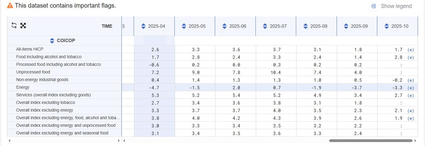 Προσωρινές εκτιμήσεις για τον πληθωρισμό Οκτωβρίου στην Ελλάδα – Υποχώρηση στις τιμές ενέργειας – επιταχύνεται ο πληθωρισμός στα τρόφιμα – πηγή: Εurostat