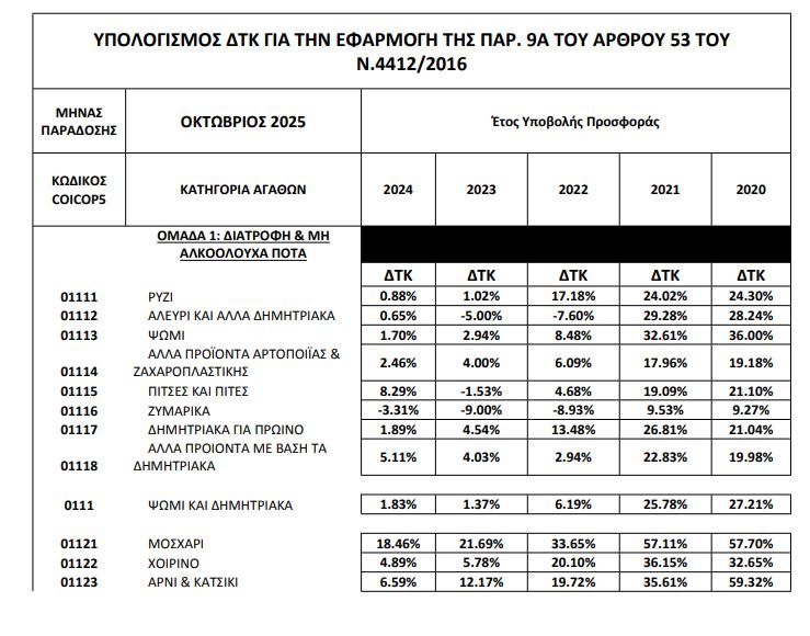 Η εγκύκλιος παρουσιάζει έναν αναλυτικό πίνακα, για τον υπολογισμό Δείκτη Τιμών καταναλωτή από το 2020 ως το 2024,  ώστε να αναπροσαρμοστεί ανάλογα το τίμημα στις δημόσιες συμβάσεις με αντικείμενο την παράδοσης αγαθών, που έλαβαν χώρα τον Οκτώβριο του 2025. Καθώς το τίμημα στις συμβάσεις προμηθειών υπολογίζεται σε ετήσια βάση, δεν περιλαμβάνονται στοιχεία για το 2025.