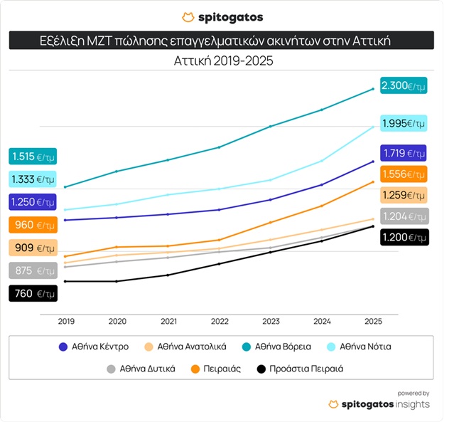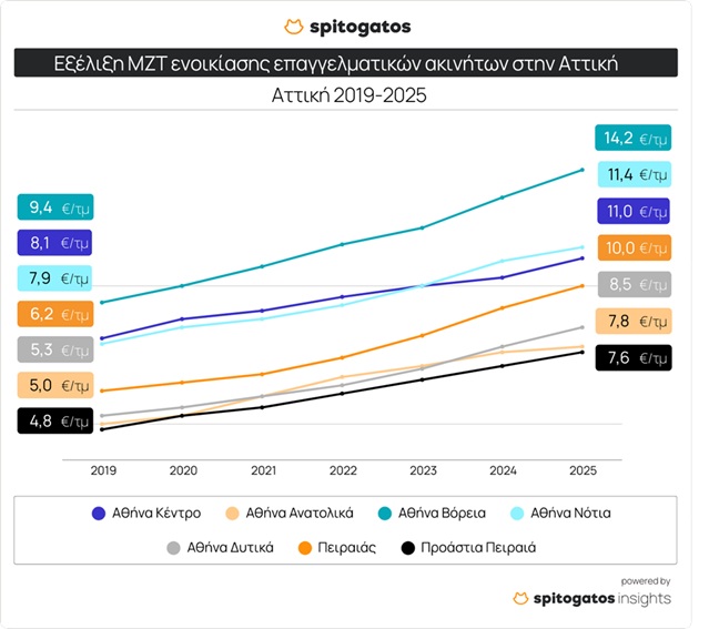 Σε ό,τι αφορά την εξέλιξη των ΜΖΤ ενοικίασης επαγγελματικών ακινήτων κατά την ίδια περίοδο 2019-2025, παρατηρείται επίσης αύξηση των μέσων ζητούμενων τιμών σε όλες τις περιοχές της Αττικής.