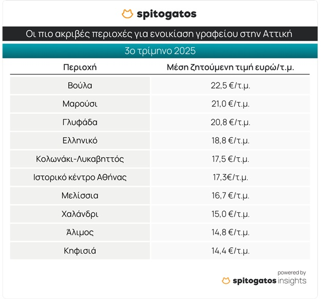 Οι ακριβότερες περιοχές της Αττικής για ενοικίαση γραφείου είναι η Βούλα, τo Μαρούσι, η Γλυφάδα, το Ελληνικό, η περιοχή Κολωνάκι-Λυκαβηττός, το ιστορικό κέντρο της Αθήνας, τα Μελίσσια, το Χαλάνδρι, ο Άλιμος και η Κηφισιά. Ενδεικτικά, η ΜΖΤ ενοικίασης γραφείου στο Σύνταγμα ανέρχεται στα 20,0 ευρώ/τ.μ. ενώ στην περιοχή της Πλάκας φτάνει τα 23,9 ευρώ/τ.μ.