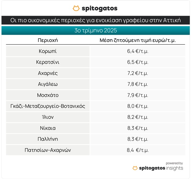 Οι πιο οικονομικές περιοχές της Αττικής για ενοικίαση γραφείου βρίσκονται στα Προάστια του Πειραιά (Κερατσίνι, Μοσχάτο, Νίκαια), στην Ανατολική Αττική (Κορωπί, Παλλήνη) και στα Δυτικά Προάστια (Αχαρνές, Αιγάλεω, Ίλιον) αλλά και στο κέντρο της Αθήνας στην περιοχή Πατησίων-Αχαρνών.