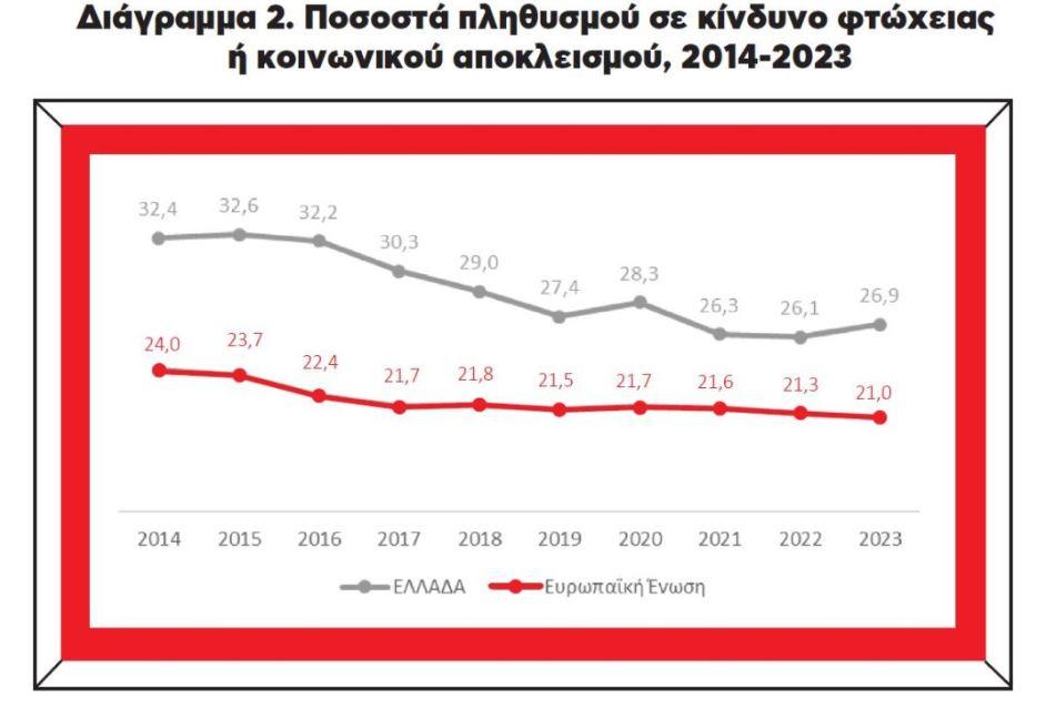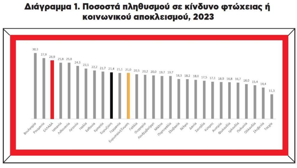 H Ελλάδα με 26,9% του πληθυσμού (2.740.051 άτομα) σε κίνδυνο φτώχειας ή κοινωνικού αποκλεισμού βρίσκεται στην τρίτη θέση της Ευρωπαϊκής Ένωσης, κάτω μόνο από τη Βουλγαρία (30,3%) και τη Ρουμανία (27,9%). Βρίσκεται επίσης αρκετά πάνω από τους μέσους όρους της Ευρωζώνης (21,4%) και της Ευρωπαϊκής Ένωσης (21%). Η Ελλάδα, επομένως, είναι μεταξύ των χωρών που οι πληθυσμοί τους αντιμετωπίζουν ιδιαίτερα οξύ οικονομικό πρόβλημα.
