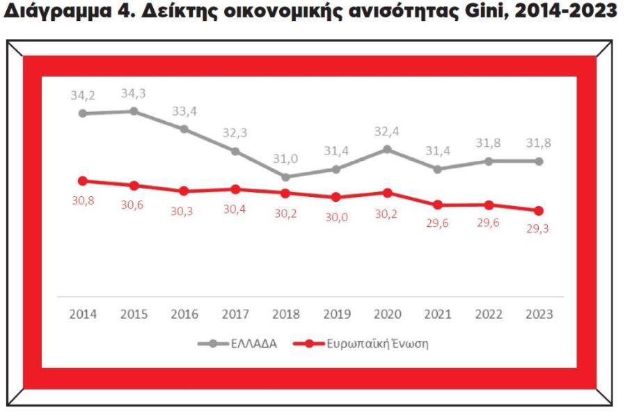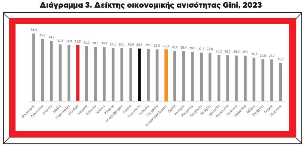 Στα στοιχεία για τον δεύτερο δείκτη στις χώρες της Ευρωπαϊκής Ένωσης με αναφορά στο έτος 2023 βλέπουμε ότι η Ελλάδα με 31,8 βρίσκεται στην έκτη υψηλότερη θέση, αρκετά πιο πάνω από τους μέσους όρους της Ευρωζώνης (29,9) και της Ευρωπαϊκής Ένωσης (29,3). Η Ελλάδα ανήκει στη διακριτή κατηγορία των χωρών της Νότιας Ευρώπης που αντιμετωπίζουν εντονότερη οικονομική ανισότητα.