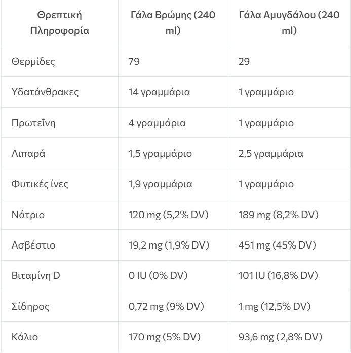 Σύγκριση θρεπτικής αξίας – Γάλα βρώμης και αμυγδάλου
