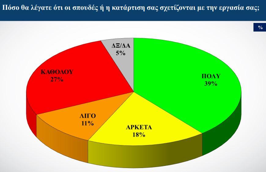 Έτσι, σύμφωνα με την έρευνα του ΙΝΕ ΓΣΕΕ, το 38% των ερωτηθέντων δηλώνουν ότι η εργασία τους δεν σχετίζεται με τις σπουδές ή την κατάρτισή τους.