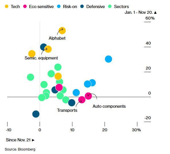 Οι ροές στρέφονται προς υποτιμημένες κυκλικές μετοχές, μετοχές μικρής κεφαλαιοποίησης και ευαίσθητα στην οικονομία τμήματα της αγοράς, καθώς οι επενδυτές τοποθετούνται έτσι ώστε να επωφεληθούν από την αναμενόμενη ώθηση της οικονομικής ανάπτυξης το επόμενο έτος.