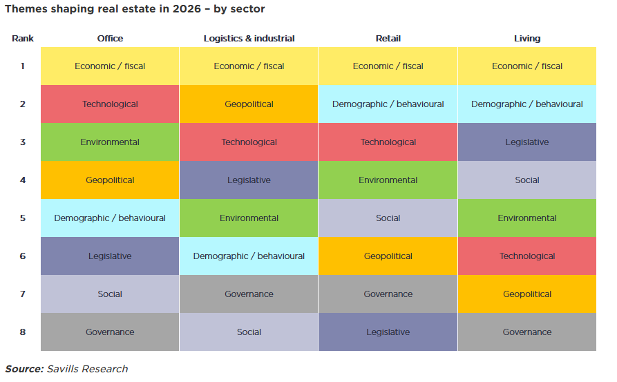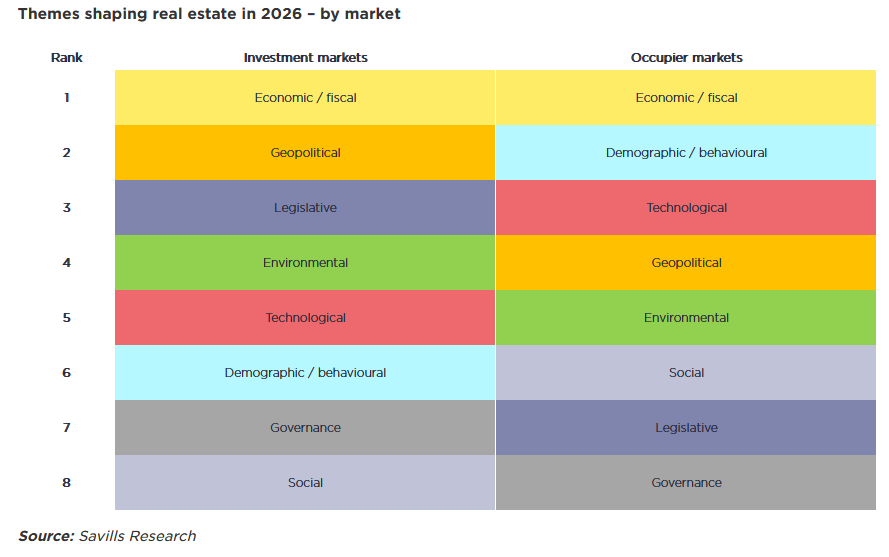 Σύμφωνα με τον Paul Tostevin, Director της Savills World Research, η οικονομική συγκυρία παραμένει ο σημαντικότερος παράγοντας για το 2026. Η αναμενόμενη αποκλιμάκωση των επιτοκίων, με πορεία προς τα λεγόμενα «ουδέτερα» επίπεδα, αναμένεται να στηρίξει τόσο τις επενδύσεις όσο και τη ζήτηση από μισθωτές.