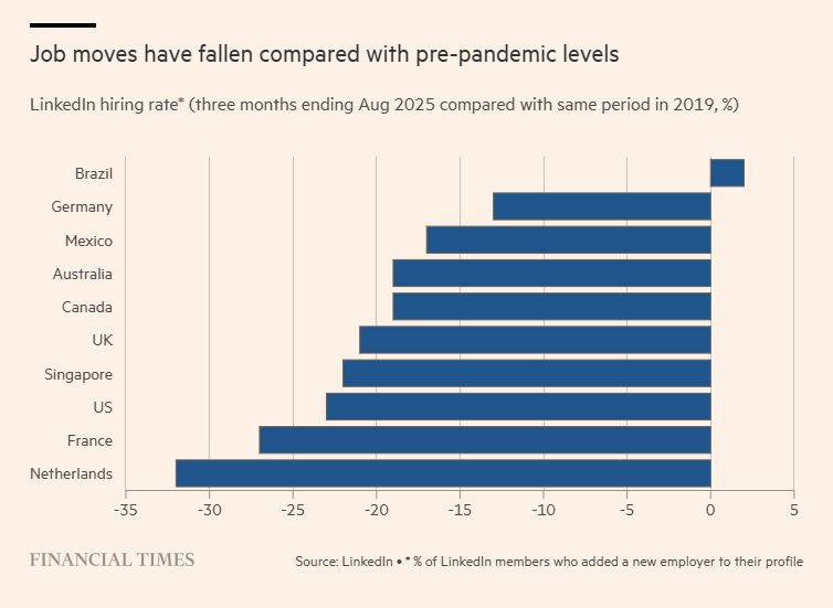 Τα στοιχεία που παρακολουθεί το LinkedIn, το επαγγελματικό κοινωνικό δίκτυο, παρουσιάζουν μια συνεπή εικόνα χαμηλής κινητικότητας στην αγορά εργασίας πολλών ανεπτυγμένων οικονομιών. Το ποσοστό των μελών που πρόσθεσαν πρόσφατα έναν νέο εργοδότη στο προφίλ τους είναι περίπου ένα πέμπτο χαμηλότερο από το προ πανδημίας ποσοστό στις ΗΠΑ, το Ηνωμένο Βασίλειο, τον Καναδά και την Αυστραλία. Είναι ακόμη χαμηλότερο στη Γαλλία και έχει μειωθεί κατά σχεδόν 15% στη Γερμανία.