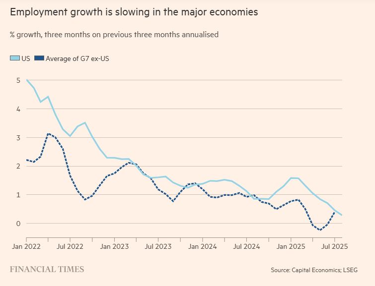 Σύμφωνα με επίσημα στοιχεία, η απασχόληση αυξήθηκε με ετήσιο ρυθμό μόλις 0,5% στις ΗΠΑ και 0,4% στις υπόλοιπες οικονομίες του G7 κατά το τρίμηνο που έληξε τον Ιούλιο. Αυτά τα ποσοστά είναι πολύ χαμηλότερα από τα ποσοστά που παρατηρήθηκαν το 2024.