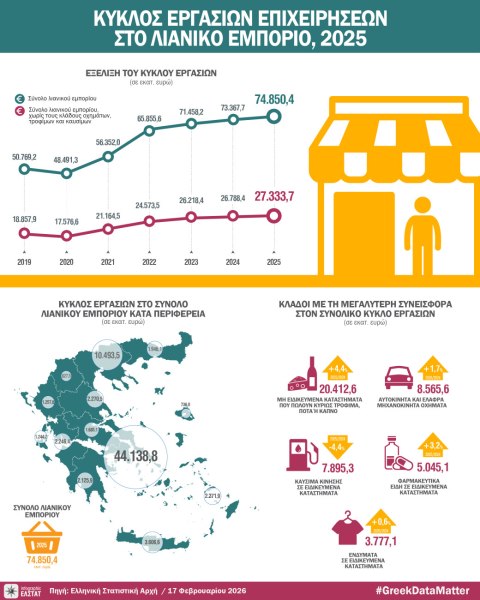 Συγκεκριμένα, το 27,3% του συνολικού τζίρου του λιανεμπορίου το 2025, προήλθε από τον  κλάδο «λιανικό εμπόριο σε μη ειδικευμένα καταστήματα που πωλούν κυρίως τρόφιμα, ποτά ή καπνό», ο οποίος αφορά τα σουπερμάρκετ. Το αντίστοιχο ποσοστό το 2024 ήταν στο 26,7%, με τον κλάδο να σημειώνει τη μεγαλύτερη αύξηση τζίρου τόσο σε ποσοστό (4,4%) όσο και ονομαστικά (πάνω από 856.000 ευρώ).