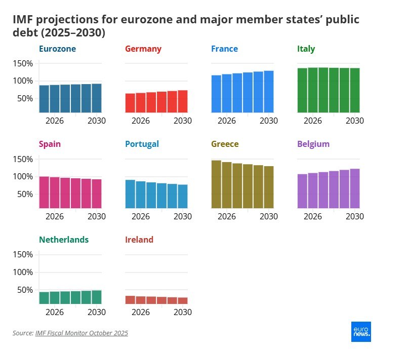 Προβολές του ΔΝΤ για το δημόσιο χρέος της ευρωζώνης και των κρατών μελών (2025–2030), μεταξύ των οποίων και της Ελλάδας: