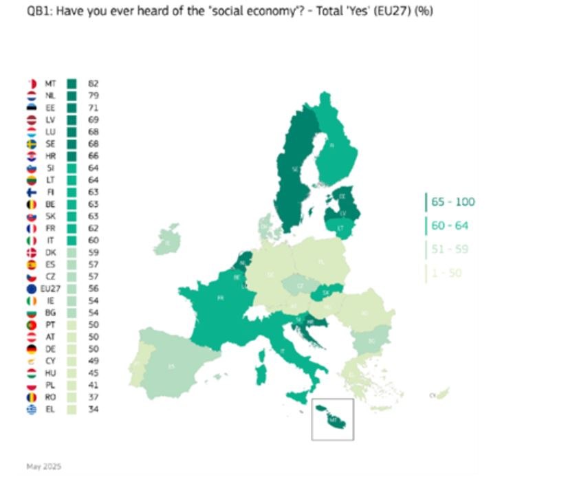 Αθροιστικά, μόνο το 34% έχει ακούσει τον όρο  «κοινωνική οικονομία» – το χαμηλότερο ποσοστό σε όλη την Ευρωπαϊκή Ένωση, κάτω από τη Ρουμανία, την Πολωνία και την Ουγγαρία (με 37%, 41,% και 45% αντίστοιχα).  Από εκεί και πέρα, σε όλες τις υπόλοιπες χώρες, ο μισός πληθυσμός τουλάχιστον έχει ακουστά για την κοινωνική οικονομία, έστω και σαν έννοια, με μέσο όρο το 56%.