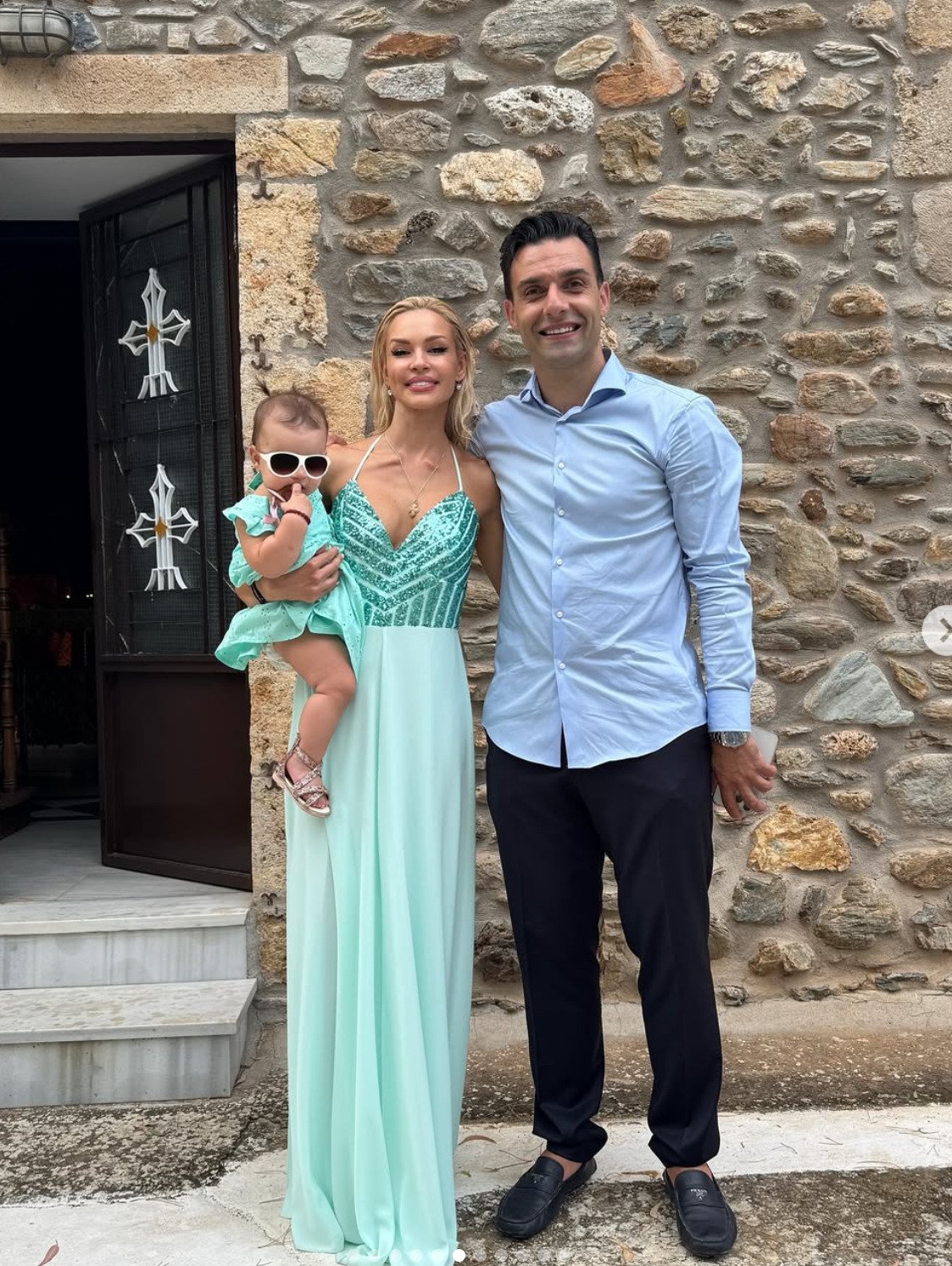 Σε μια από τις φωτογραφίες, η ηθοποιός πόζαρε αγκαλιά με την κόρη της, έχοντας στο πλευρό της και τον Γιώργο Τζαβέλλα, σε ένα τρυφερό οικογενειακό στιγμιότυπο.