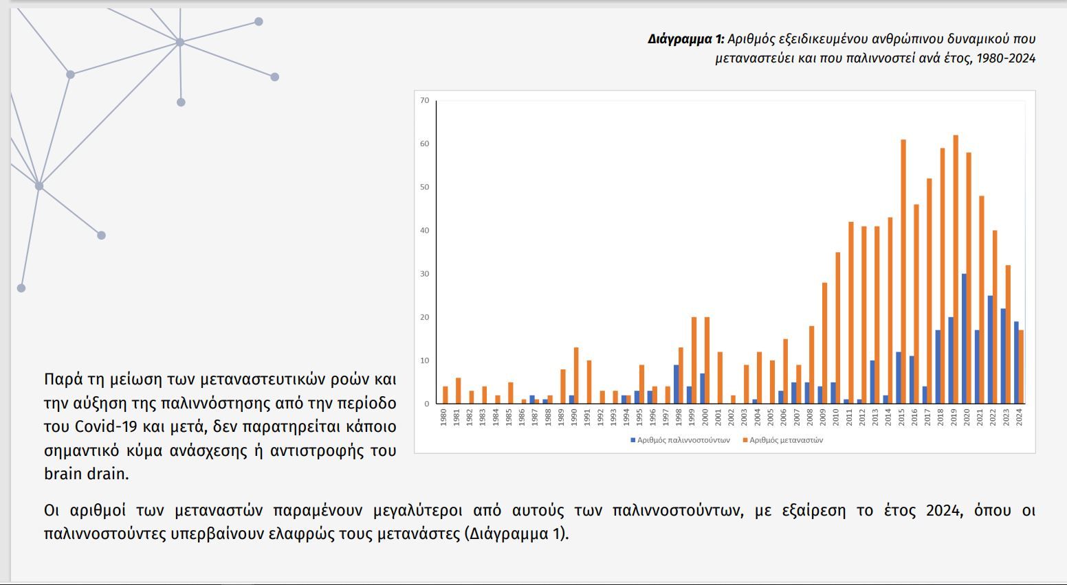 Από την ανάλυση των δεδομένων προκύπτει ότι παρά τη μείωση των μεταναστευτικών ροών και την αύξηση της παλιννόστησης από την περίοδο του Covid-19 και μετά, δεν παρατηρείται κάποιο σημαντικό κύμα ανάσχεσης ή αντιστροφής του brain drain.