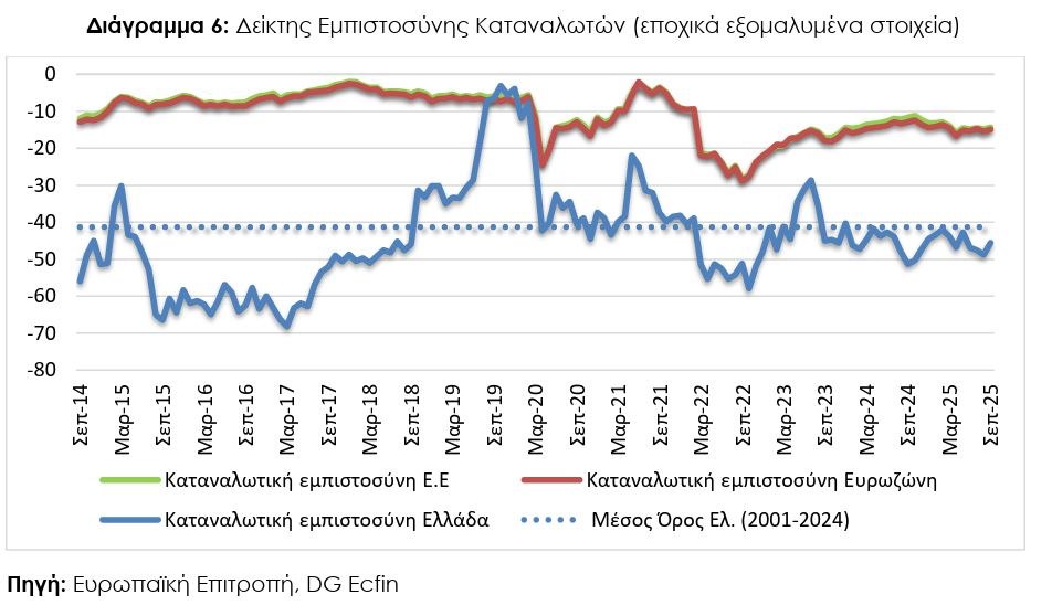 Οι αρνητικές προβλέψεις των καταναλωτών για την οικονομική κατάσταση του νοικοκυριού τους τους προσεχείς 12 μήνες υποχώρησαν τον Σεπτέμβριο στις -39,8 (από -45,2). Το 54% (από 59%) των νοικοκυριών αναμένει ελαφρά ή αισθητή επιδείνωση της οικονομικής του κατάστασης, ενώ το 6% προβλέπει μικρή βελτίωση. Οι δείκτες σε ΕΕ και Ευρωζώνη διαμορφώθηκαν στις -4,7 και -4,6 μονάδες αντίστοιχα.