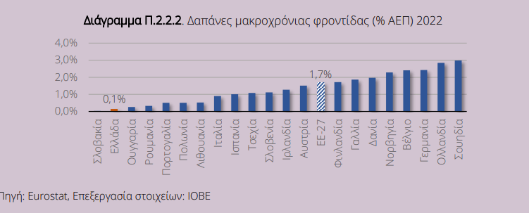 Σύμφωνα με τα πιο πρόσφατα διαθέσιμα δεδομένα, οι δημόσιες δαπάνες για μακροχρόνια φροντίδα στην Ελλάδα το 2022 αντιστοιχούσαν μόλις στο 0,1% του ΑΕΠ, κατατάσσοντας τη χώρα στη δεύτερη χαμηλότερη θέση μεταξύ των κρατών-μελών της Ευρωπαϊκής Ένωσης, ενώ ο μ.ό. της ΕΕ-27 διαμορφώθηκε στο 1,7%.