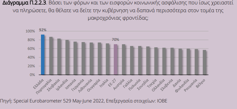 Το ΙΟΒΕ υπογραμμίζει την έντονη κοινωνική ζήτηση για ενίσχυση των σχετικών δαπανών, όπως αναδεικνύεται μέσα και από συγκριτική μελέτη μεταξύ των χωρών μελών της ΕΕ που εμβαθύνει στις τάσεις και πολιτικές στην εν λόγω θεματική με τη συντριπτική πλειοψηφία των Ελλήνων (92%, που αποτελεί το υψηλότερο ποσοστό στην ΕΕ) να επιθυμεί την σημαντική αύξησή τους.