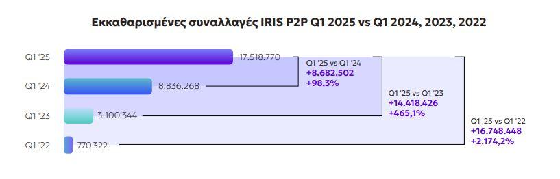 Οι χρήστες του IRIS Person to Person την 31/03/2025 ανέρχονταν σε 3.642.673. Το μέγεθος αυτό είναι αυξημένο κατά 46,7% έναντι του 2024, κατά 35,9% έναντι του 2023 και κατά 270,8% έναντι του 2022.