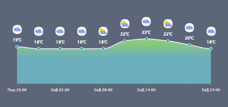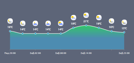 Οι άνεμοι θα πνέουν στα δυτικά από νότιες διευθύνσεις 3 με 4 μποφόρ και στα ανατολικά από βόρειες διευθύνσεις με την ίδια ένταση, στρεφόμενοι βαθμιαία σε νότιους. Η θερμοκρασία δεν θα σημειώσει αξιόλογη μεταβολή.