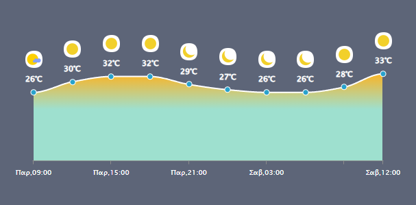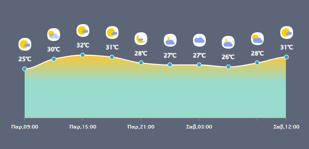 Η θερμοκρασία δε θα σημειώσει αξιόλογη μεταβολή, και θα φτάσει το μεσημέρι τους 31-33 βαθμούς Κελσίου, και στη δυτική Ελλάδα έως 34.