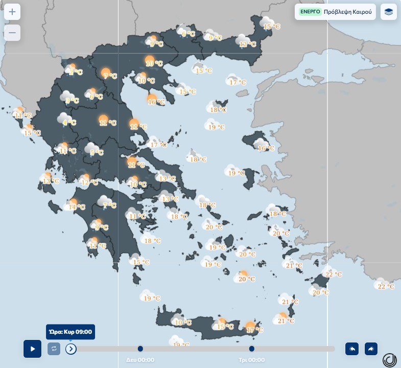 Καιρός: Νεφώσεις με τοπικές βροχές και, έως το μεσημέρι στα νησιά του ανατολικού Αιγαίου και στη συνέχεια στα Δωδεκάνησα (περιοχή Ρόδου – Καστελλόριζου), κατά τόπους καταιγίδες. Από το απόγευμα στα βόρεια βελτιωμένος καιρός.