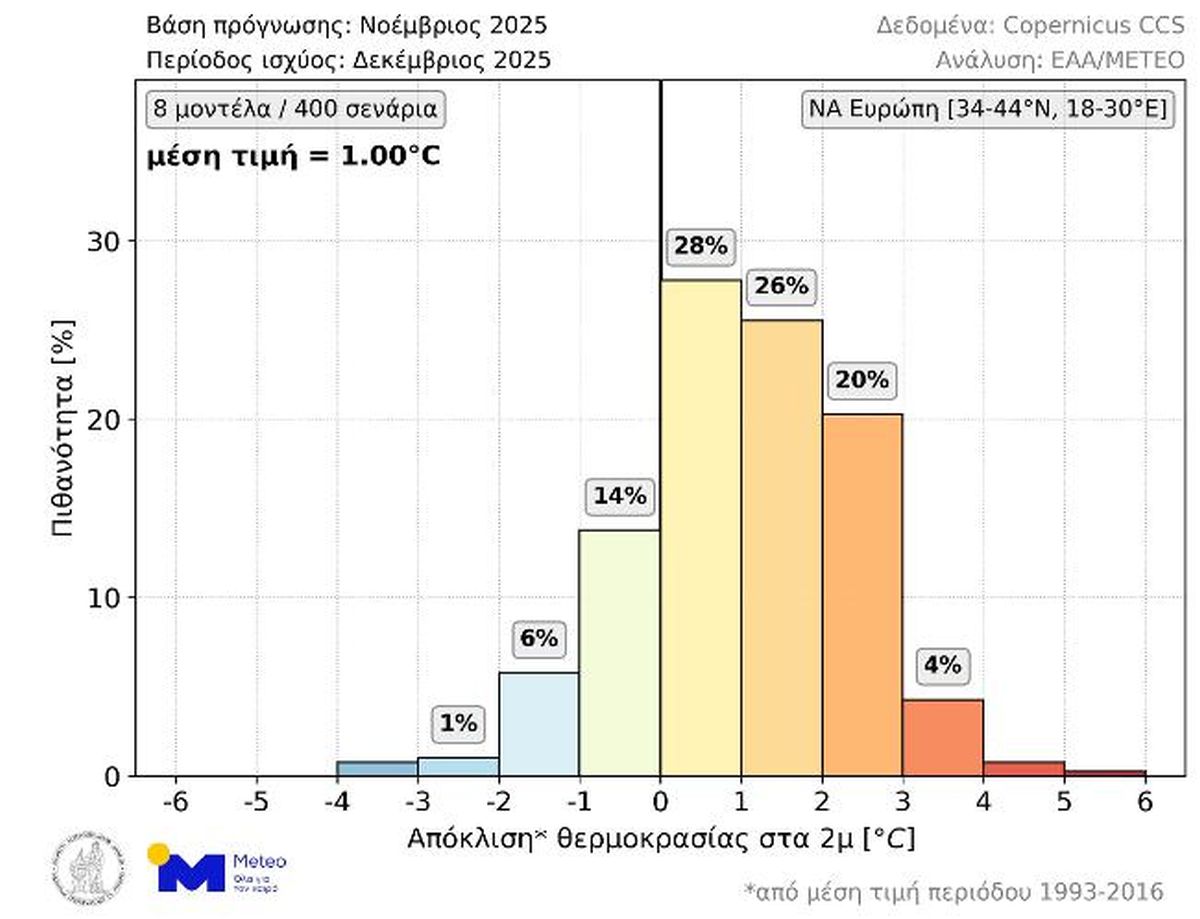 Όπως φαίνεται στο γράφημα του meteo σύμφωνα με το 78,5% των διαθέσιμων σεναρίων η μέση θερμοκρασία Δεκεμβρίου θα είναι υψηλότερη από τα κανονικά για την εποχή επίπεδα (περίοδος αναφοράς: 1993-2016).