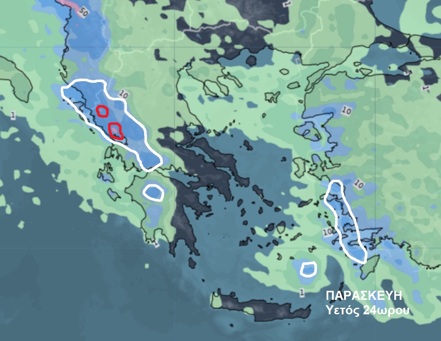 Την Παρασκευή τα πιο έντονα φαινόμενα θα περιοριστούν κυρίως στα Βορειοδυτικά και τα Δωδεκάνησα. Οι βροχές και οι καταιγίδες θα παραμείνουν τοπικά ισχυρές, αλλά χωρίς τη γενικευμένη ένταση της Πέμπτης.