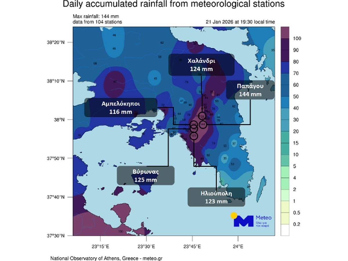 Σύμφωνα με το δίκτυο αυτόματων μετεωρολογικών σταθμών του Εθνικού Αστεροσκοπείου Αθηνών Meteo.gr τα μεγαλύτερα ύψη βροχής μέχρι τις 20:00 χθες καταγράφηκαν στην περιοχή Παπάγου με 146.4mm, ακολουθεί η Τακτικούπολη Τριζοινίας με 130.4mm και ο Βύρωνας με 126.4mm όπως αποτυπώνεται στο Χάρτη 1.