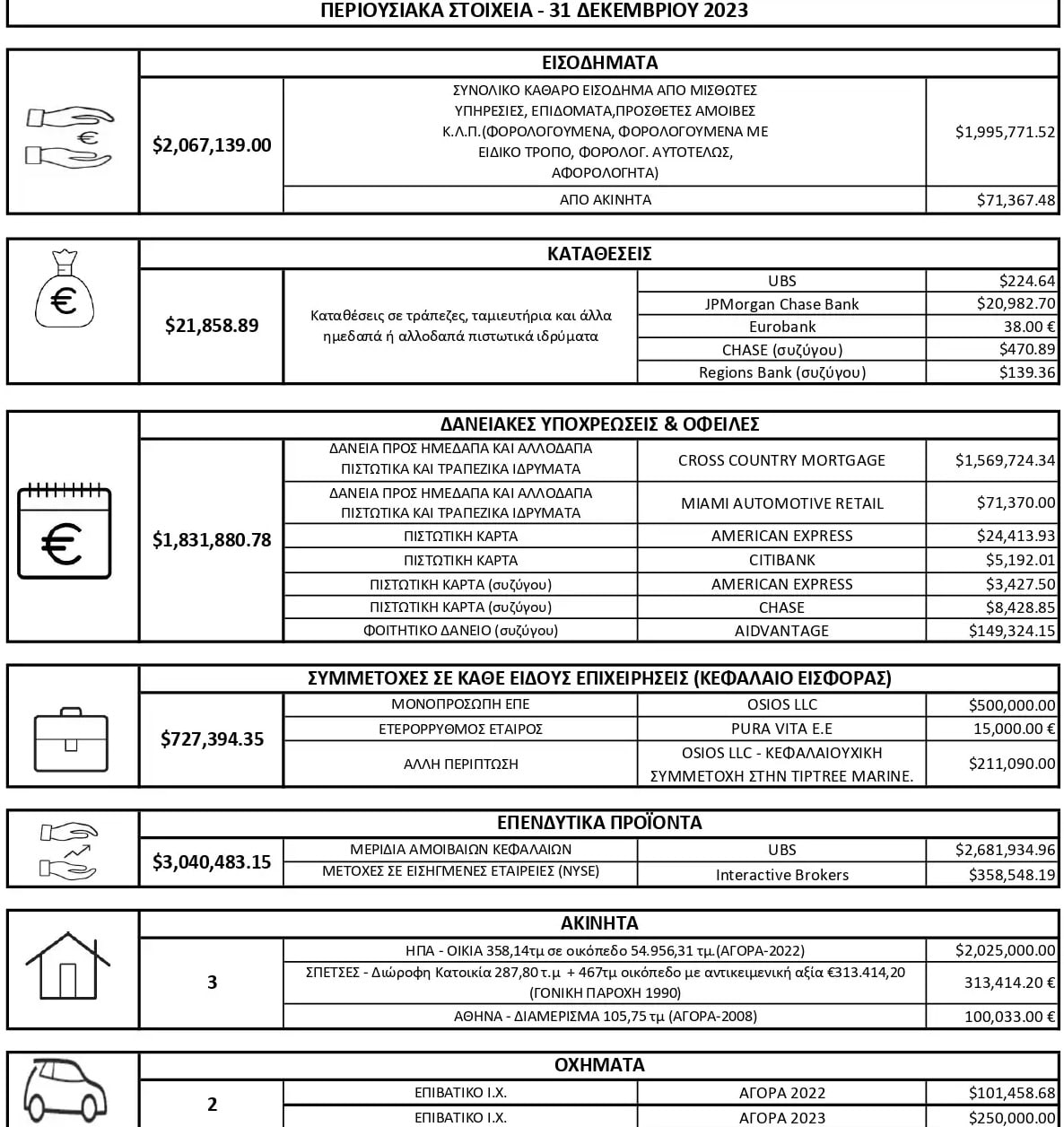 «Σας παρουσιάζω όλα τα περιουσιακά μου στοιχεία. Εγώ ήμουν επιχειρηματίας στην Αμερική, ό,τι απέκτησα ήταν με κόπο, μόνο το 2022 έβγαλα 49,8 εκατομμύρια κέρδος για τους επενδυτές μου.