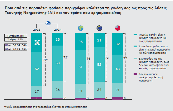 Ένας στους δύο καταναλωτές (52%) αναφέρουν ότι έχουν κάποια γνώση του τι είναι η τεχνητή νοημοσύνη και πώς χρησιμοποιείται. Συγχρόνως, 28%, από 18% πριν έναν χρόνο,δηλώνουν ότι γνωρίζουν καλά τι είναι και πώς χρησιμοποιείται.