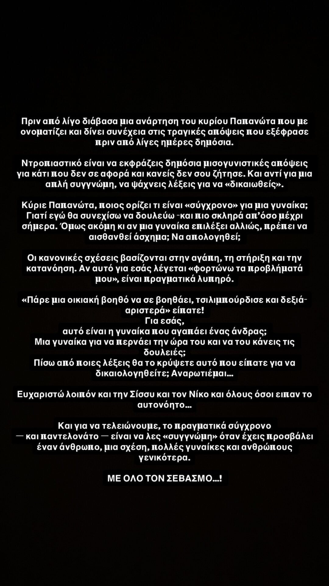Κύριε Παπανώτα, ποιος ορίζει τι είναι «σύγχρονο» για μια γυναίκα; Γιατί εγώ θα συνεχίσω να δουλεύω – και πιο σκληρά απ’ όσο μέχρι σήμερα. Όμως ακόμη κι αν μια γυναίκα επέλεξε αλλιώς, πρέπει να αισθανθεί άσχημα; Να απολογηθεί;