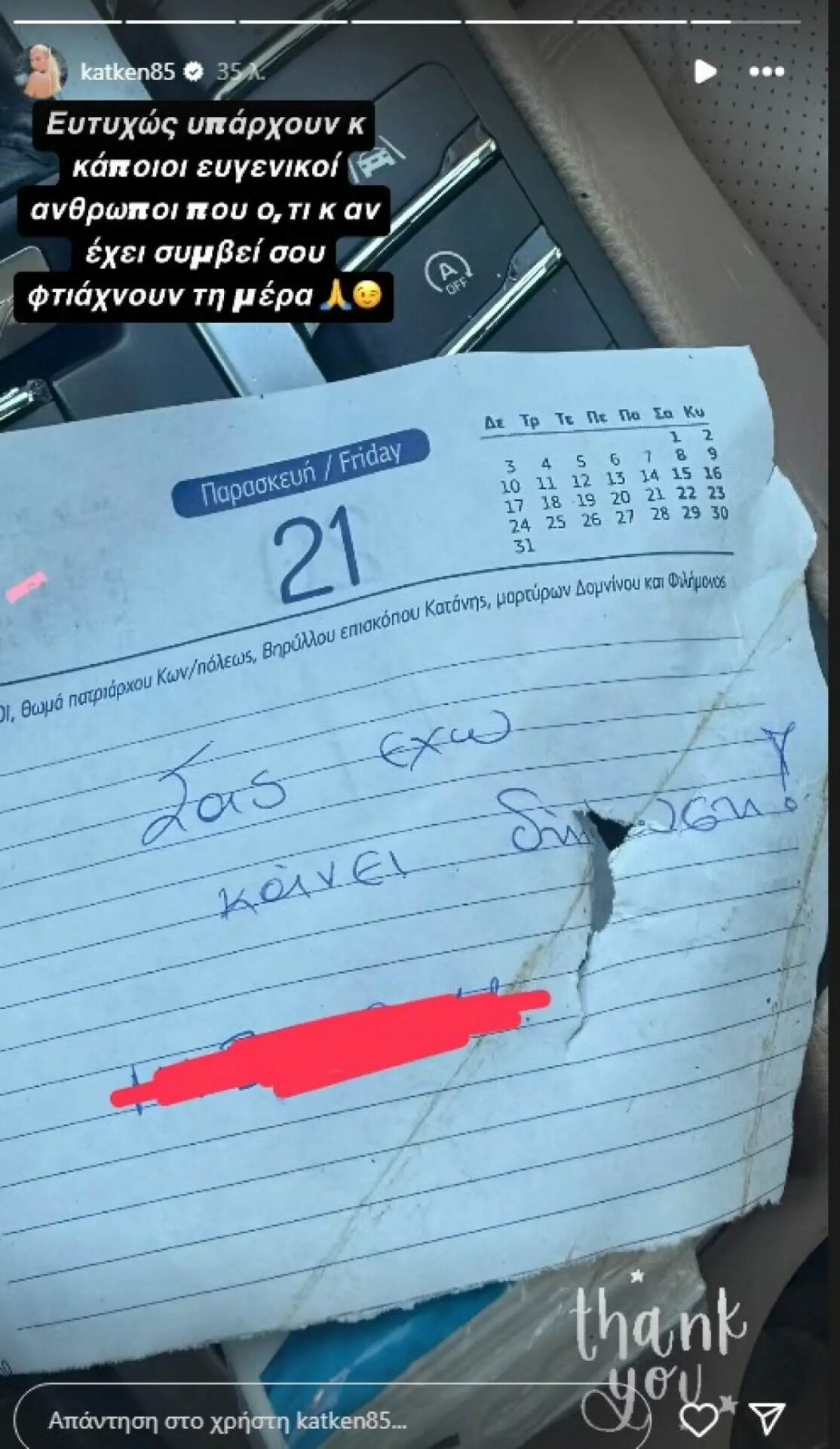 Όταν είδε το αυτοκίνητο της τρακαρισμένο, η Κατερίνα Καινούργιου σίγουρα θα σκέφθηκε πως η εβδομάδα δεν ξεκινάει με τον καλύτερο τρόπο, όταν κοίταξε καλύτερα εντυπωσιάστηκε γιατί ο άγνωστος οδηγός που της «χτύπησε» το αυτοκίνητο την πληροφορούσε με ένα σημείωμα πως ήδη έχει κάνει δήλωση και προφανώς θα της άφησε και τα στοιχεία του.