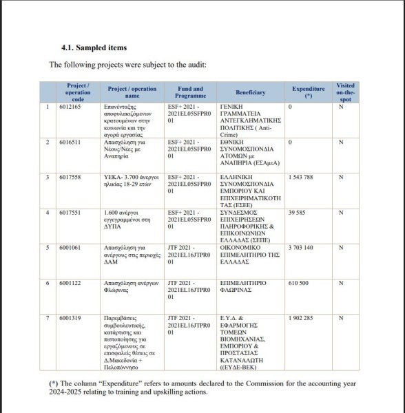 Η έκθεση εξετάζει επτά ενδεικτικά έργα που χρηματοδοτήθηκαν μέσω ευρωπαϊκών ταμείων, μεταξύ των οποίων το πρόγραμμα επανένταξης αποφυλακιζόμενων κρατουμένων, δράσεις απασχόλησης για άτομα με αναπηρία (ΕΣΑμεΑ), κατάρτιση 3.700 νέων ανέργων μέσω της ΕΣΕΕ, πρόγραμμα για 1.600 ανέργους της ΔΥΠΑ (ΣΕΠΕ), δράσεις απασχόλησης σε περιοχές Δίκαιης Αναπτυξιακής Μετάβασης από το Οικονομικό Επιμελητήριο Ελλάδας, αντίστοιχο πρόγραμμα στη Φλώρινα, καθώς και δράσεις κατάρτισης εργαζομένων σε επισφαλείς θέσεις μέσω της ΕΥΔΕ-ΒΕΚ. (Ειδική Υπηρεσία Διαχείρισης και Εφαρμογής Τομέων Βιομηχανάις Εμπορίου και Προστασίας Καταναλωτή).