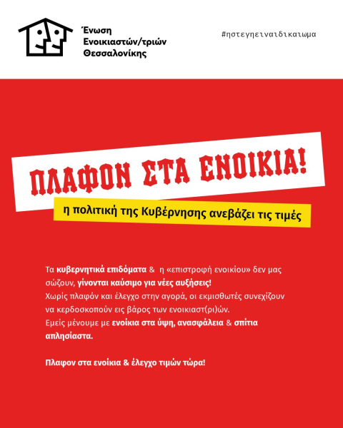 «Ζητάμε πλαφόν στις αυξήσεις των τιμών ενοικίων με βάση αντικειμενικά κριτήρια, όπως είναι η παλαιότητα του ακινήτου, η τοποθεσία, η ενεργειακή του κλάση κλπ. με βάση το μοντέλο της Ολλανδίας και μακροπρόθεσμα ένα πραγματικό απόθεμα κοινωνικής κατοικίας. Όχι με ‘’δωράκια’’ στον κατασκευαστικό κλάδο, αλλά ένα απόθμεα που θα βρίσκεται υπό κοινωνικό έλεγχο και θα παραχωρείται με βάση τις κοινωνικές ανάγκες και όχι τις τιμές της αγοράς».