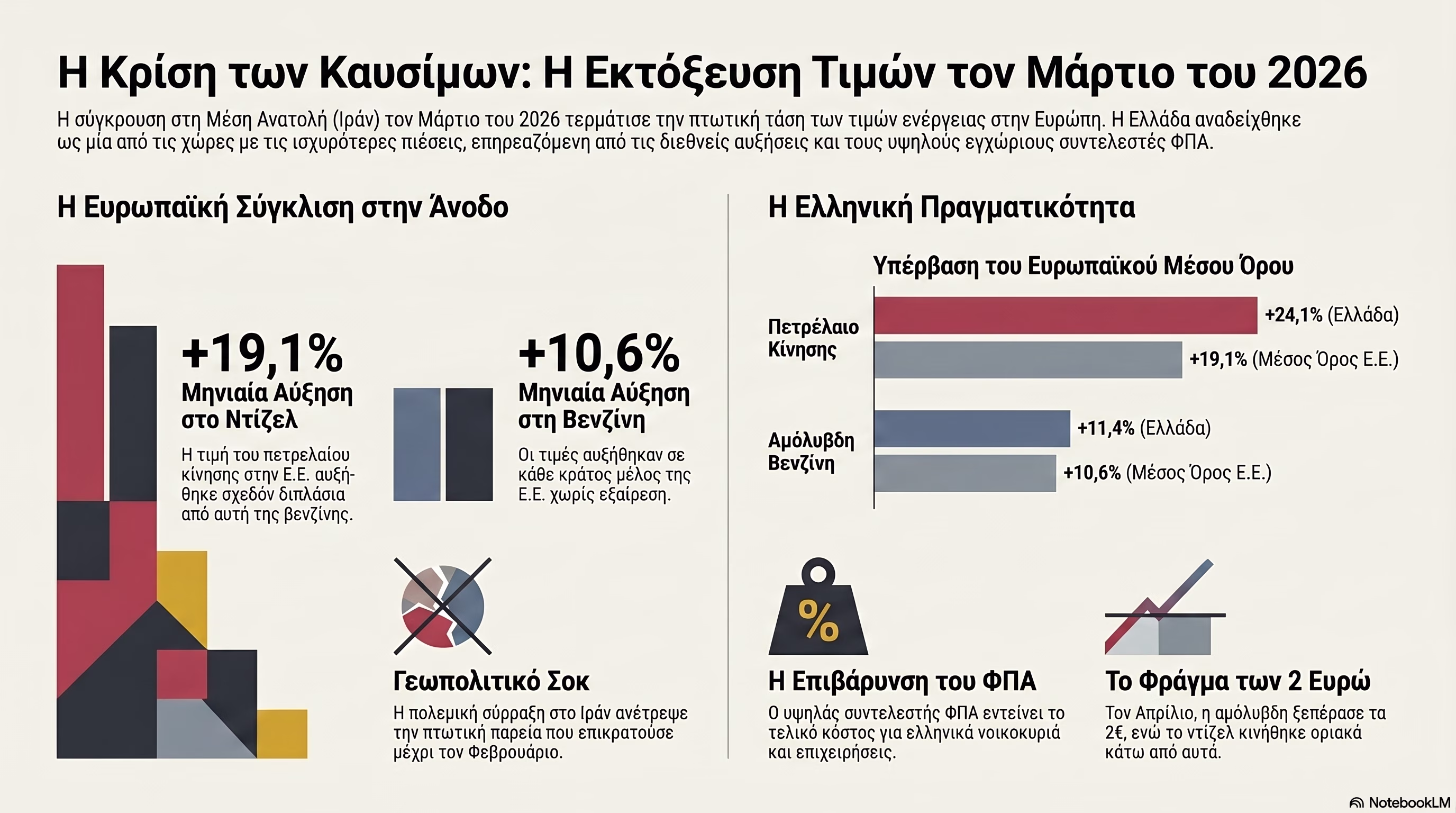 Εκτίναξη των τιμών στην Ευρώπη την άνοιξη του 2026, η οποία αποδίδεται κυρίως στις γεωπολιτικές συγκρούσεις στη Μέση Ανατολή. Η Ελλάδα επηρεάστηκε έντονα από αυτές τις αυξήσεις, με το κόστος του ντίζελ να ξεπερνά σημαντικά τον ευρωπαϊκό μέσο όρο